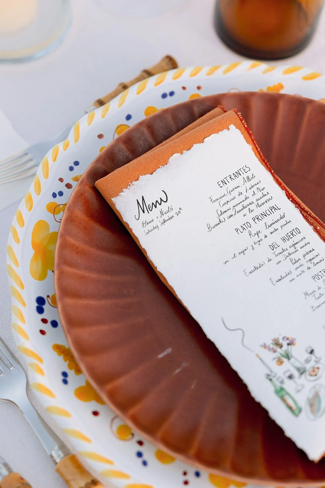 The dining setup, designed with the help of Tableset Luxury Rentals and The Ibiza Chair Company, featured rustic tables, natural linens, and organic ceramics that mirrored the tones of the land. Custom stationery by Leonardo Possatiand tactile paper goods by Toscolano Paper added subtle layers of detail and texture.